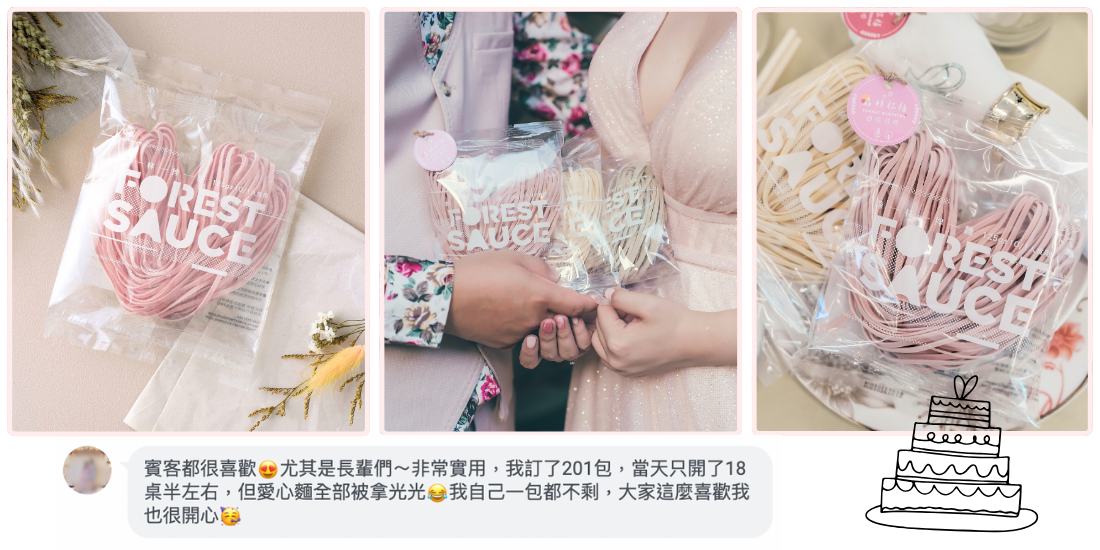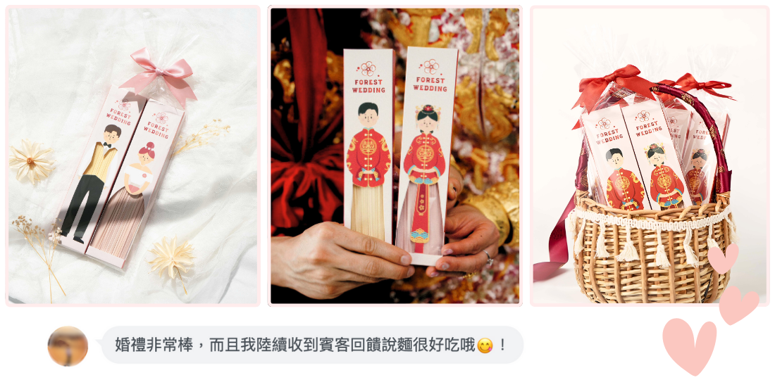 💐森林囍麵多款特色麵食:裸麵、拌麵、造型麵,每一種都是新人推薦的婚禮小物,也能透過客製化更加獨一無二>>> 浪漫都在這