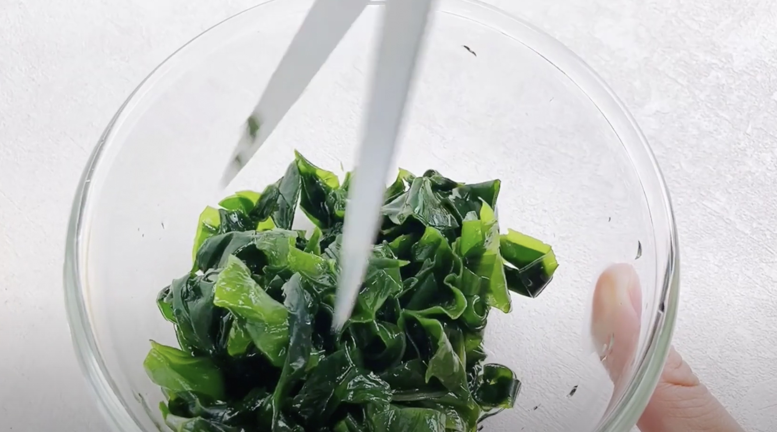 第二步 : 將海菜、吻仔魚用剪刀剪細碎狀/
