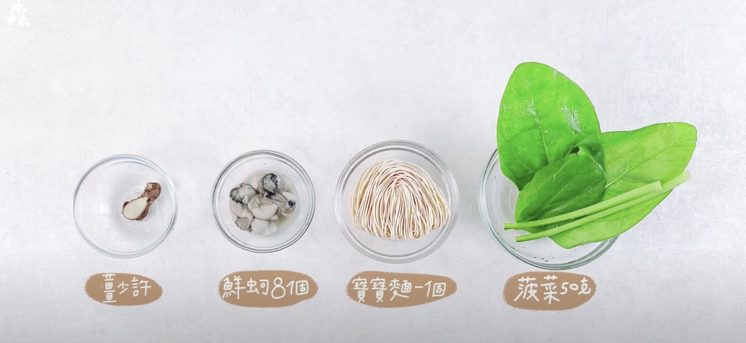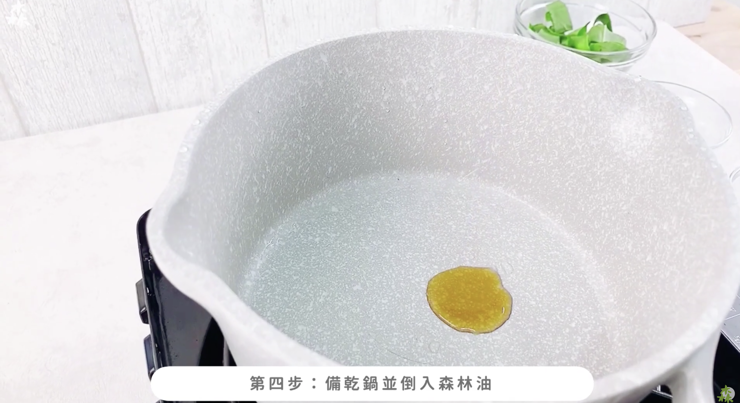 等鍋子水分蒸發後,放入森林油,並依序倒入薑絲、鮮蚵、菠菜,稍微拌炒
