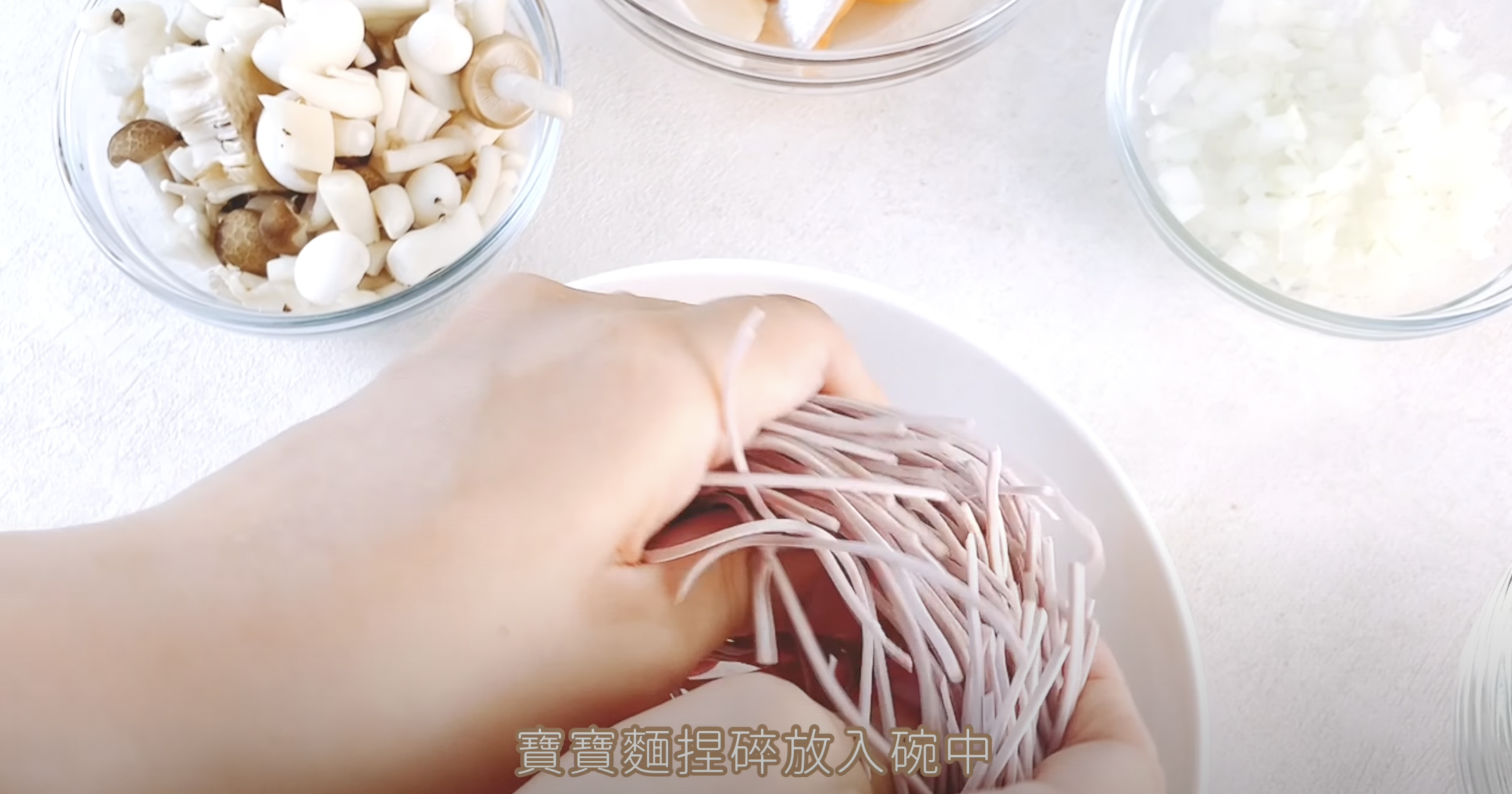 將所有食材放入碗中後,再將寶寶麵掐碎在碗中