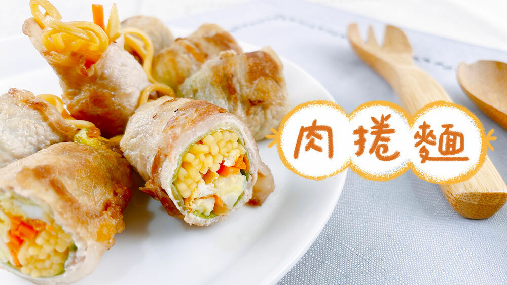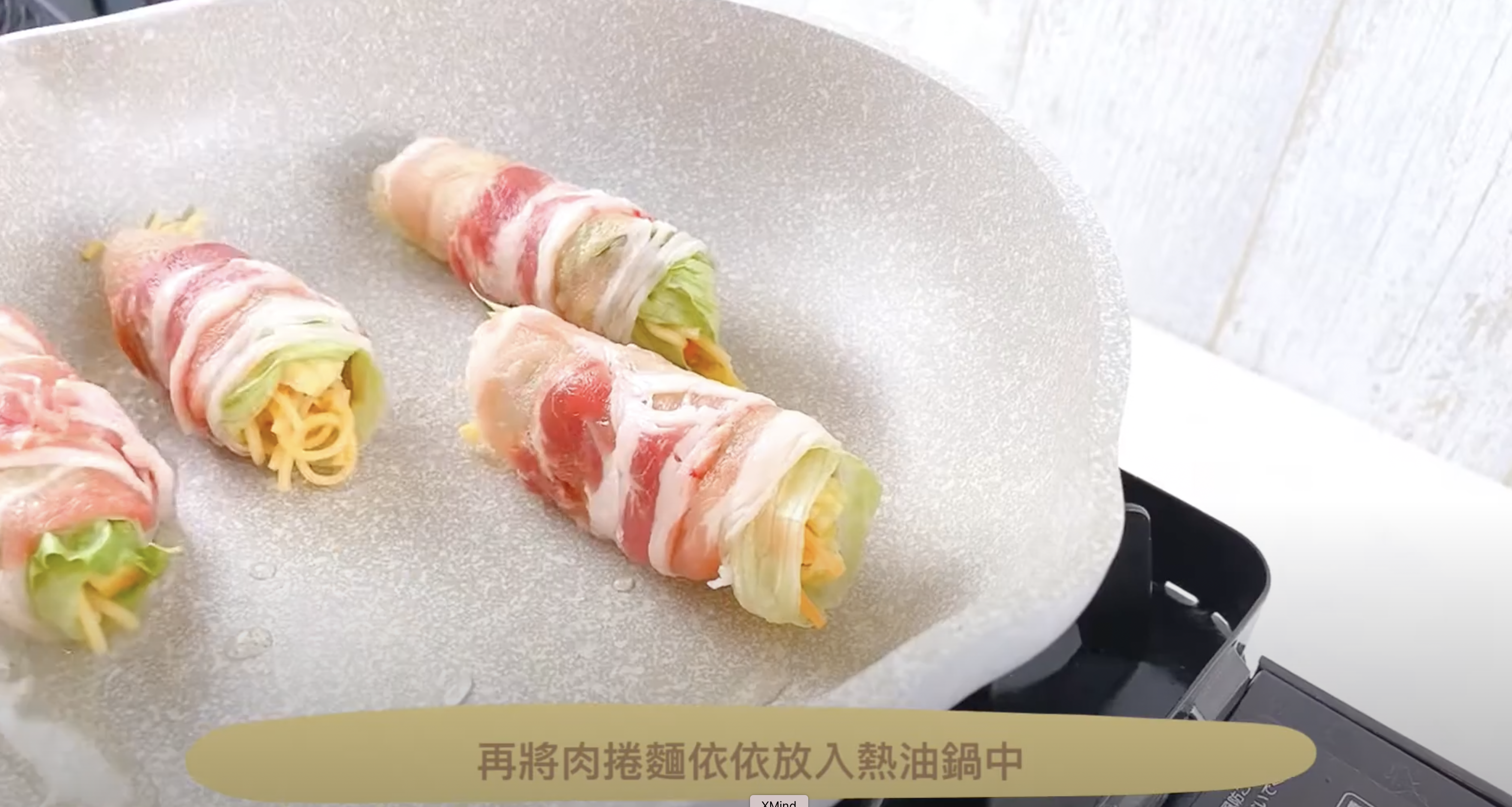 熱鍋後,將肉捲麵放入鍋中,並煎至金黃色後,