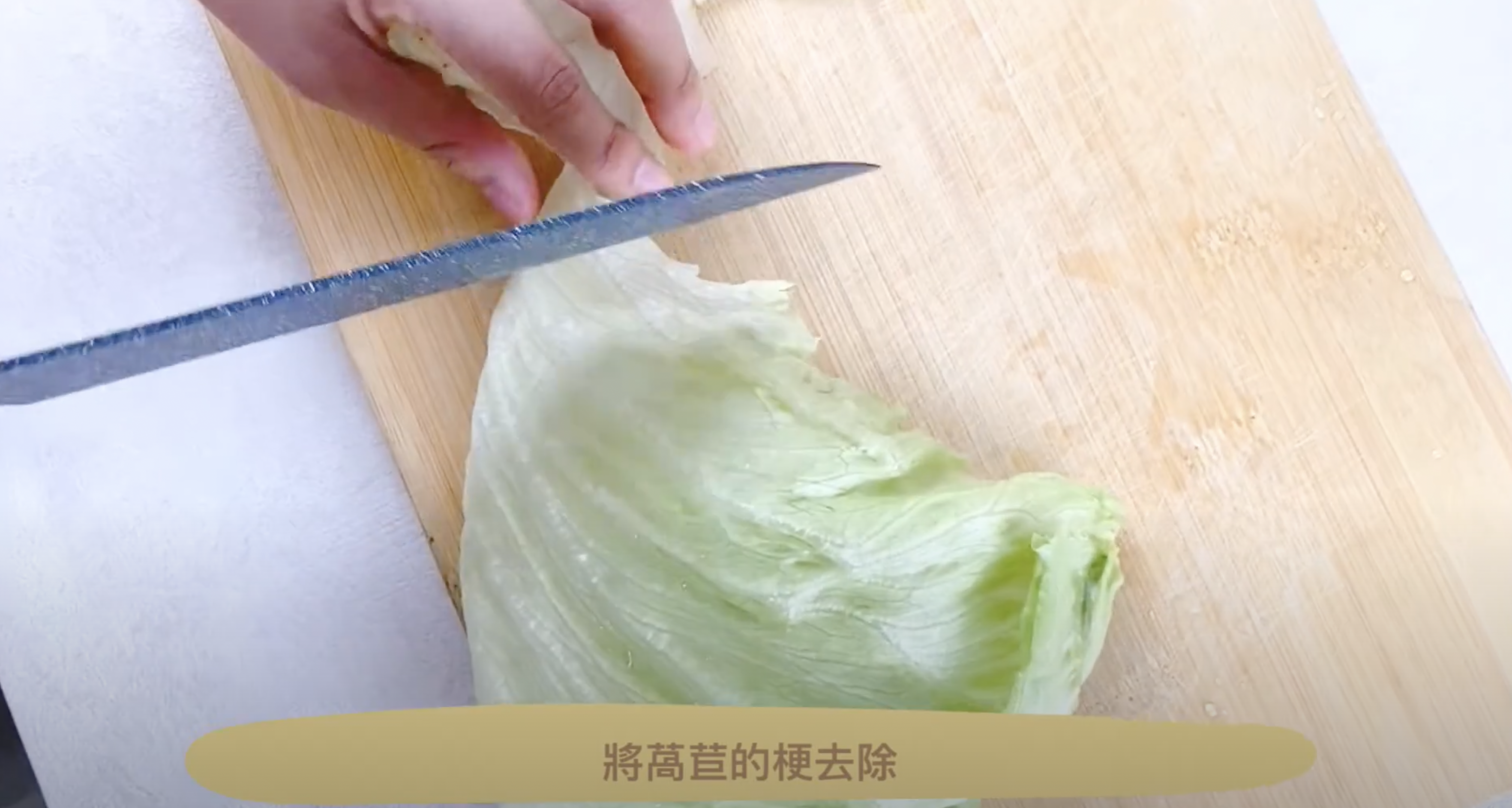 萵苣在處理時,需先將較硬的梗去除後,再對半切備用