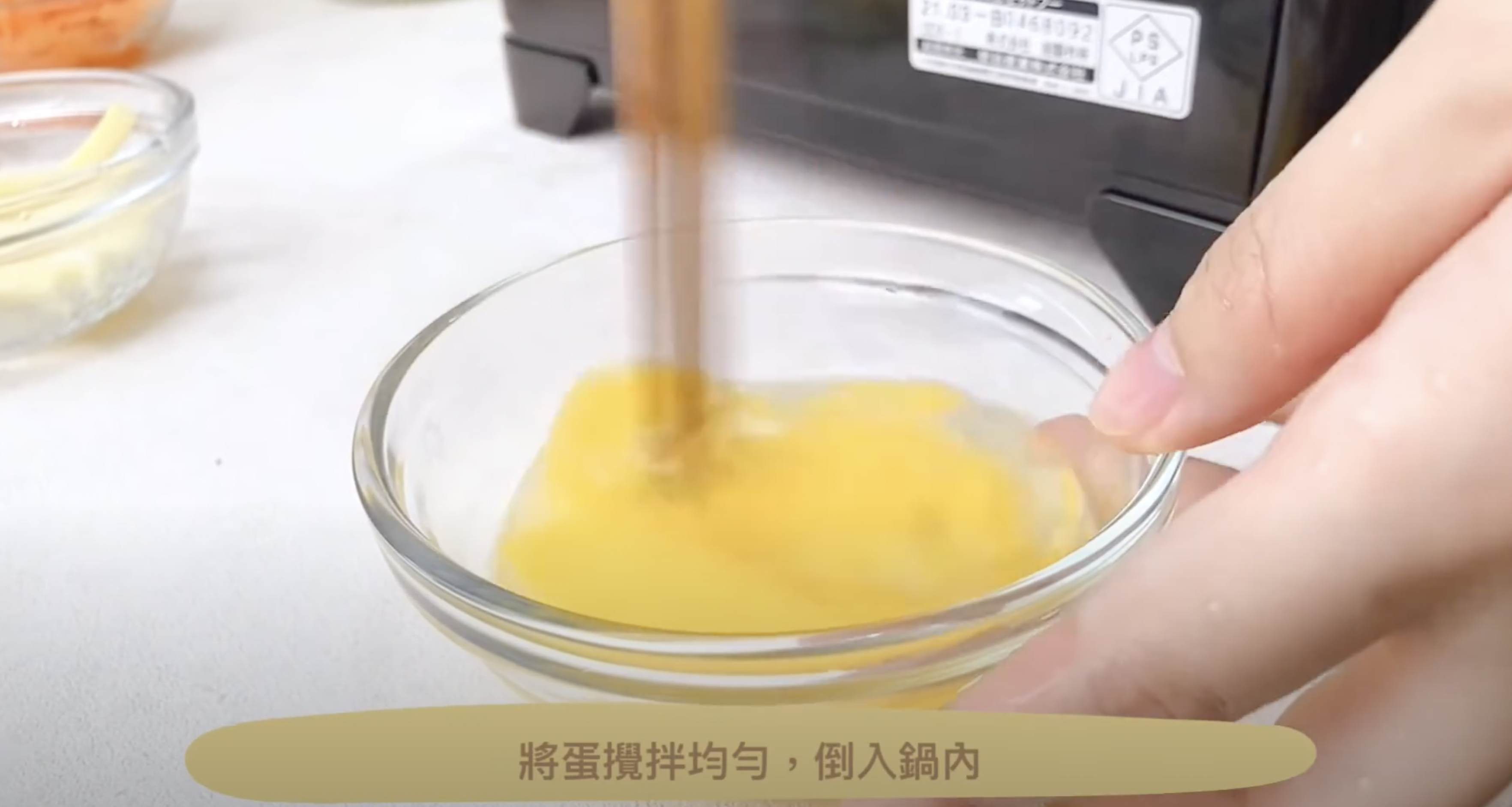 切完食材後,先熱油鍋煎蛋液,煎至兩面金黃色後,再切成蛋絲