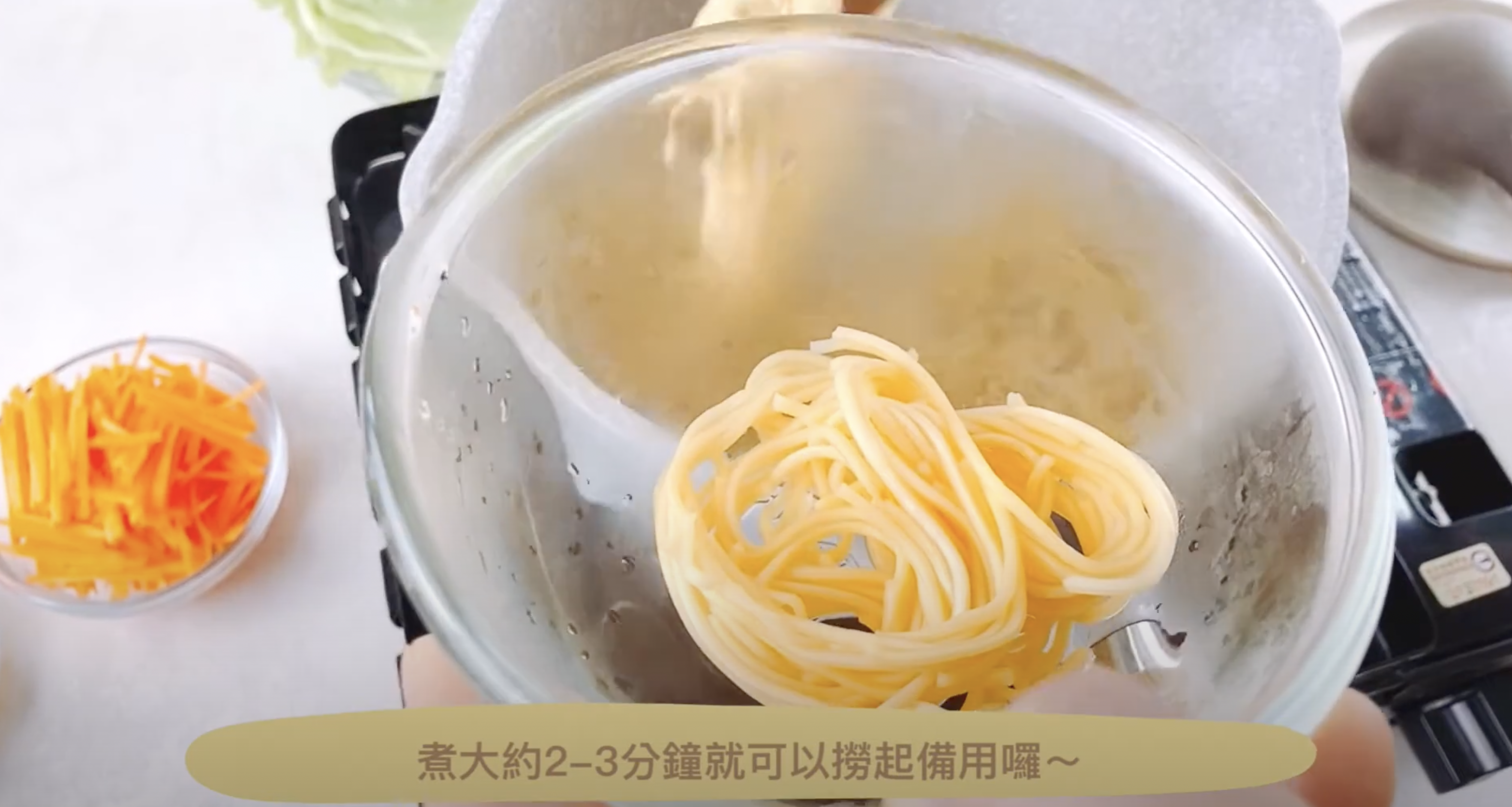 第三步 : 將寶寶麵、紅蘿蔔絲、玉米筍川燙/