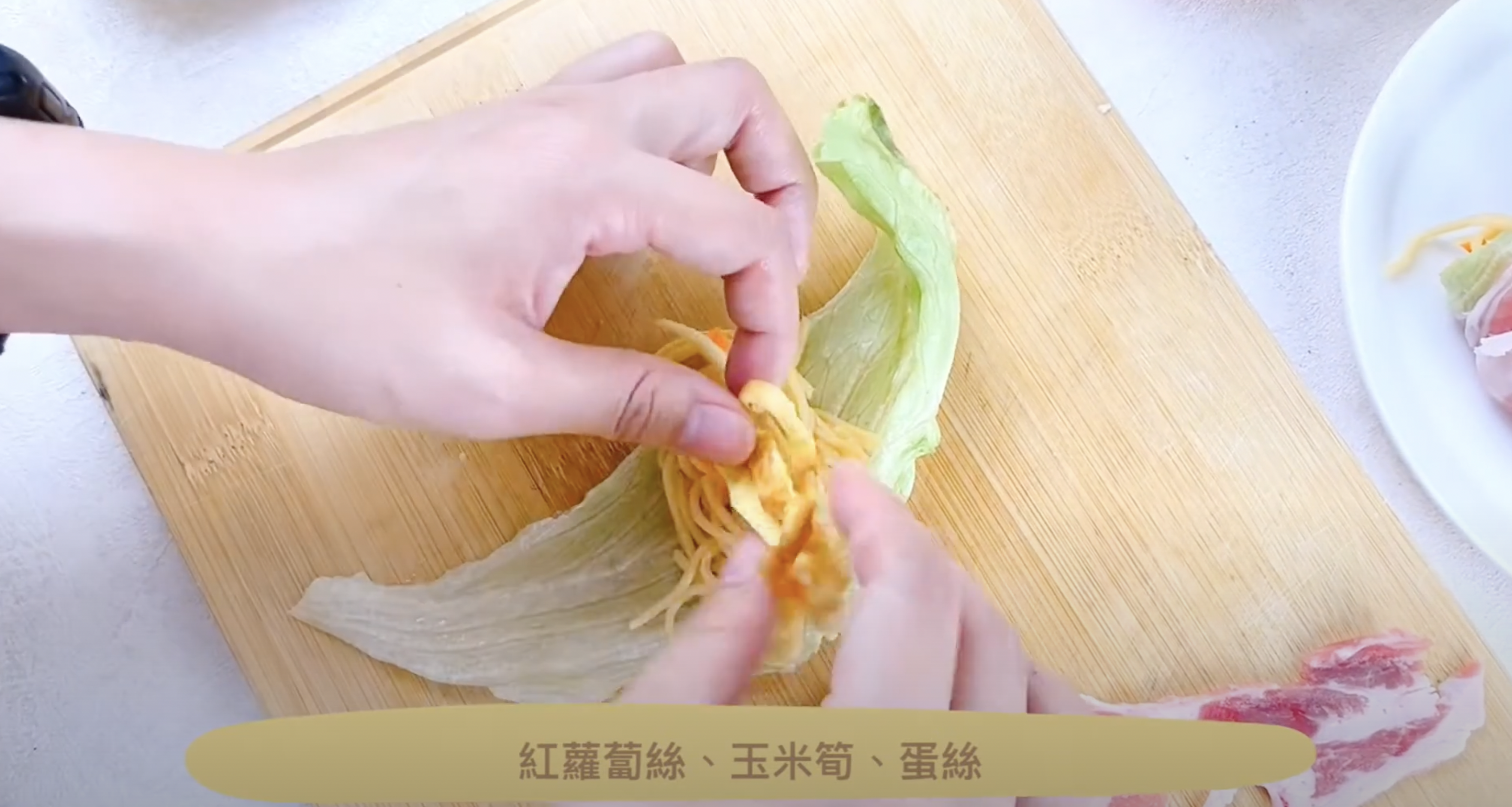 將萵苣鋪平在桌上後,將所有食材鋪在菜上後,