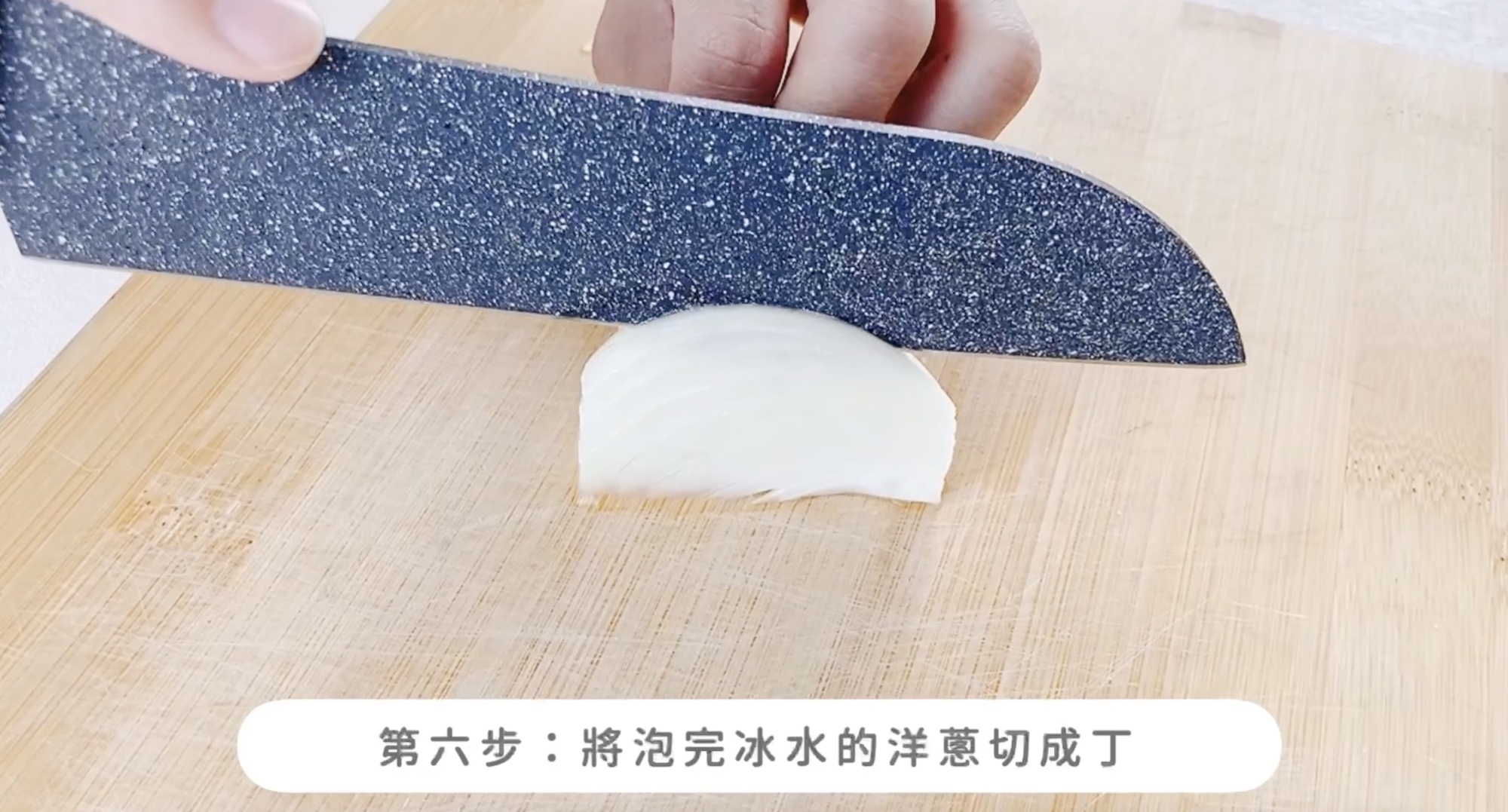 將泡在冰水中的洋蔥取出,並甩乾水後,切成丁狀