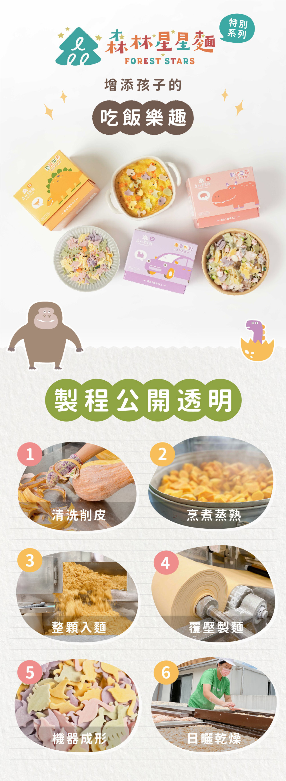 特別推出每款各11種造型的特別星星麵系列,麵片為1.5cm,比常態款的星星麵(2.3cm)更小巧一些,特別款也選用了四種蔬果(綜合款),讓營養樂趣一次滿足!