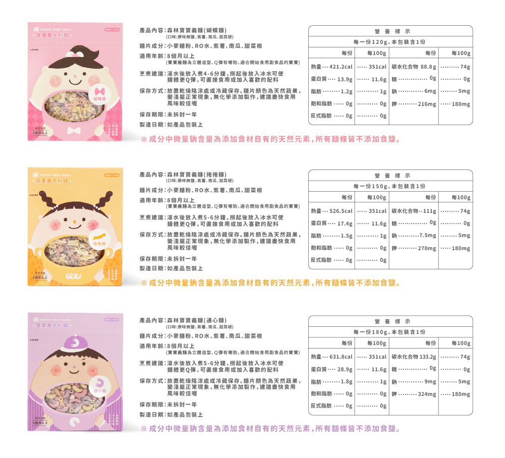 ● 蝴蝶麵(120g) ● 螺旋麵(150g) ● 通心麵(180g)