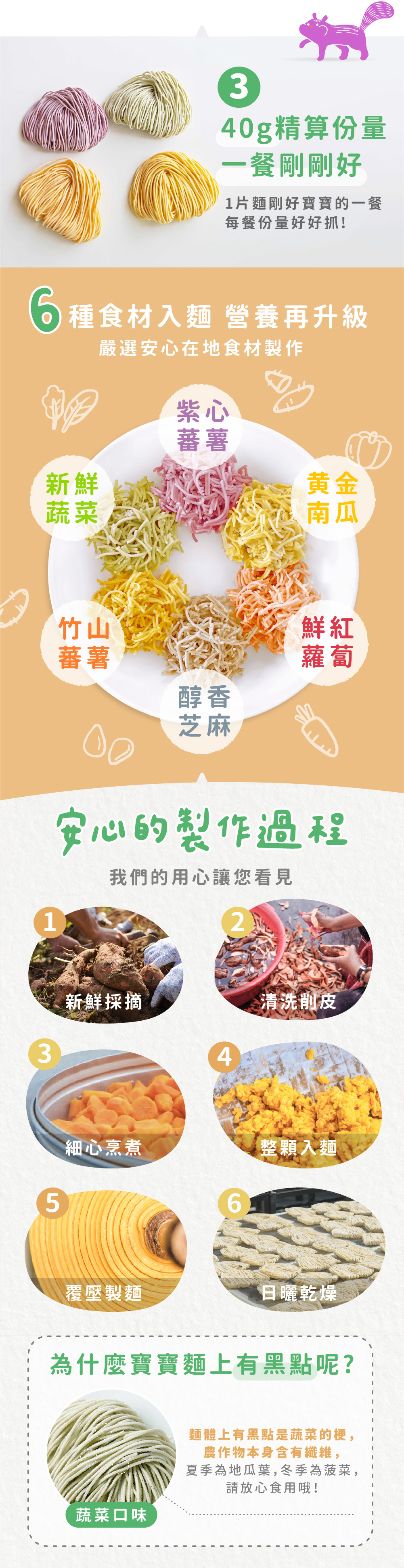 寶寶每日所需的鈉含量必須低於200毫克,而寶寶麵的鈉含量來自食材本身約只有2毫克且完全無鹽呦!