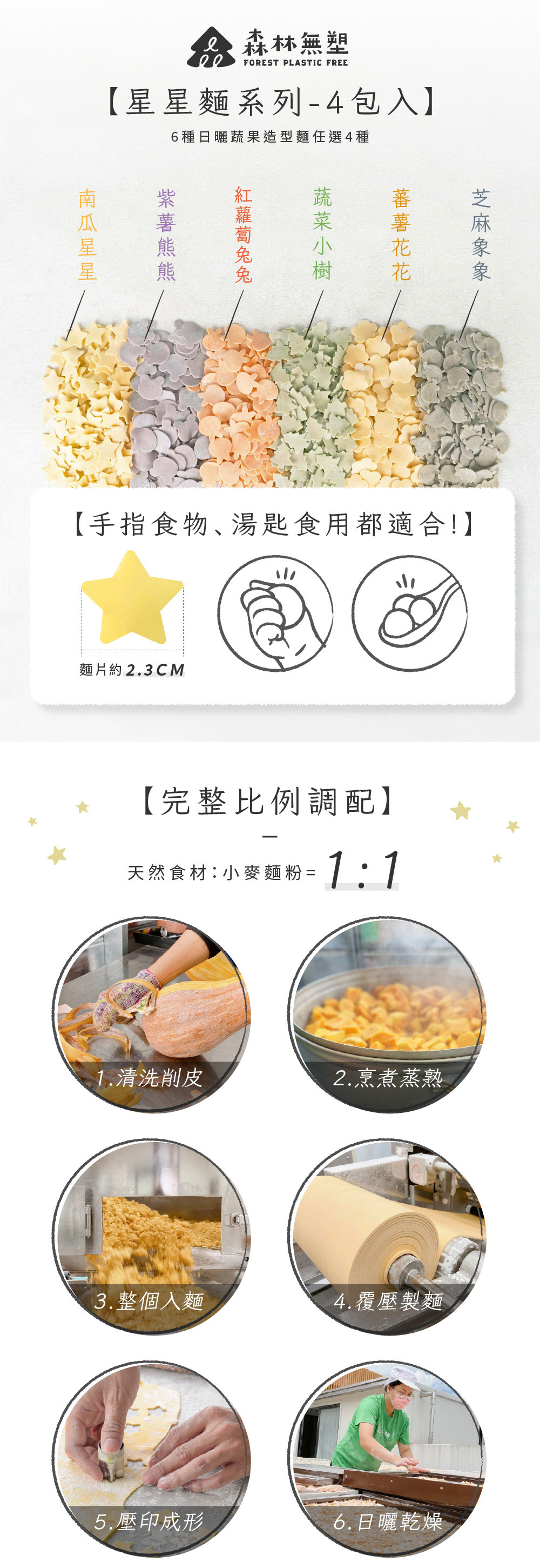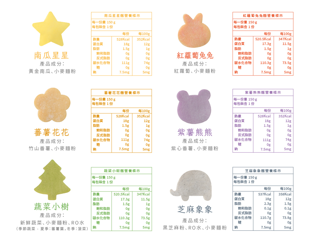 口味:蔬菜小樹、紫薯熊熊、蕃薯花花、南瓜星星、紅蘿蔔兔兔、芝麻象象