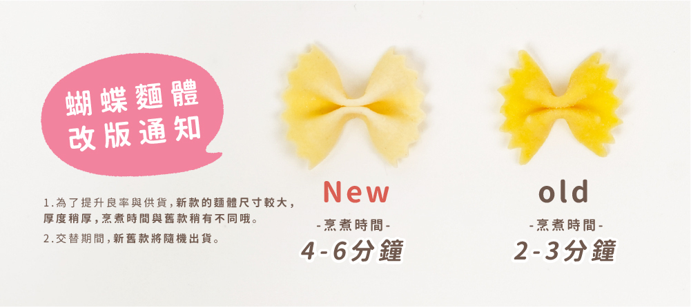 ● 蝴蝶麵(120g) ● 螺旋麵(150g) ● 通心麵(180g)