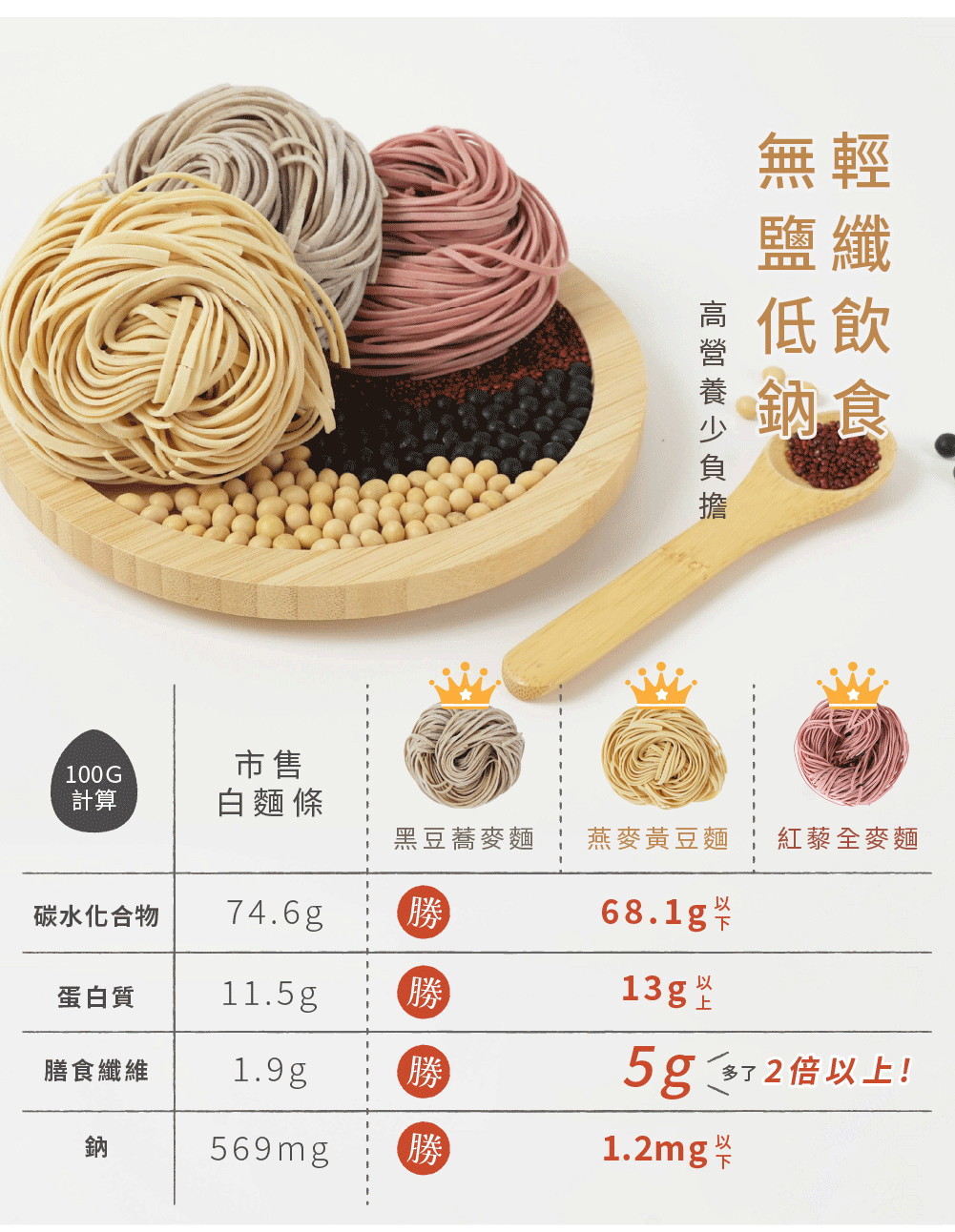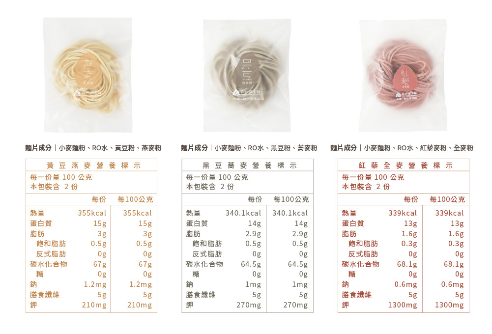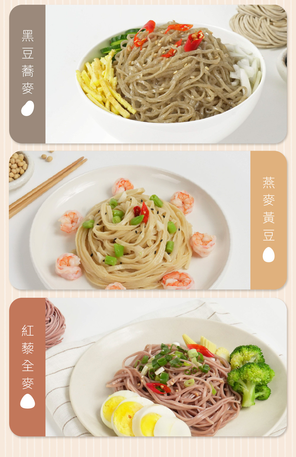 3種穀物麵條:紅藜全麥、燕麥黃豆、黑豆蕎麥