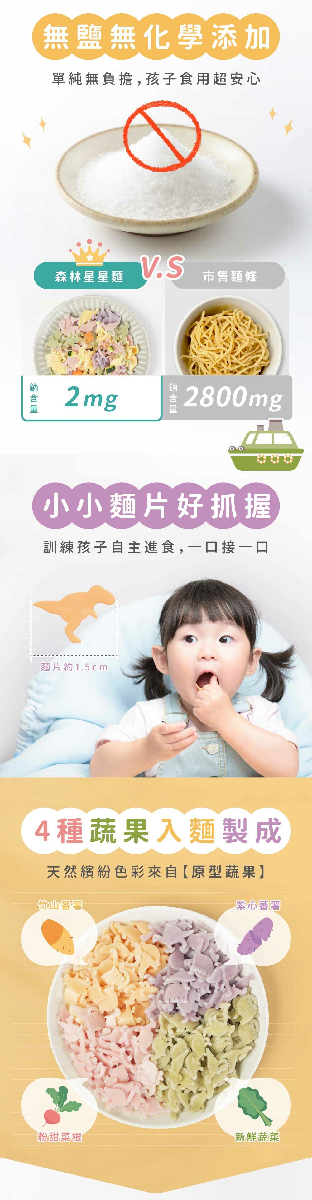 寶寶每日所需的鈉含量必須低於200毫克,而星星麵的鈉含量來自食材本身約只有2毫克且完全無鹽呦!