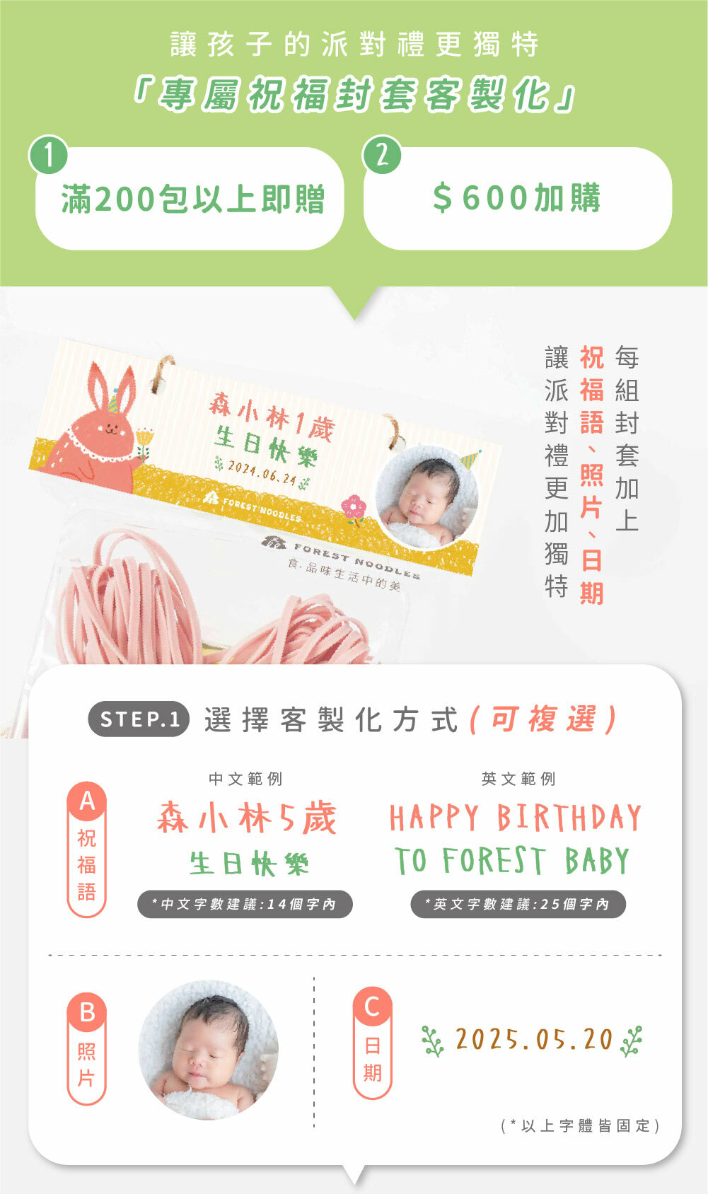 這款寶寶派對禮有不同區間量的優惠價,另外,凡是購買200份以上皆可享有免費客製化的服務哦!