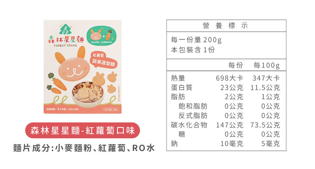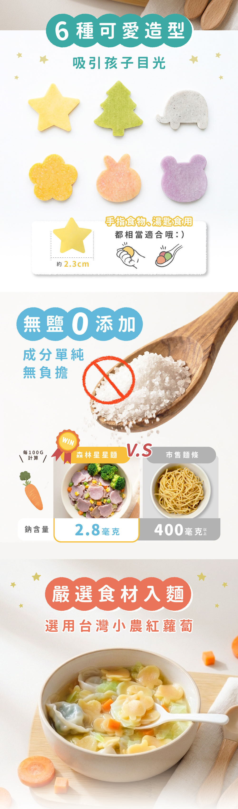 寶寶每日所需的鈉含量必須低於200毫克,而星星麵的鈉含量來自食材本身約只有2毫克且完全無鹽呦!