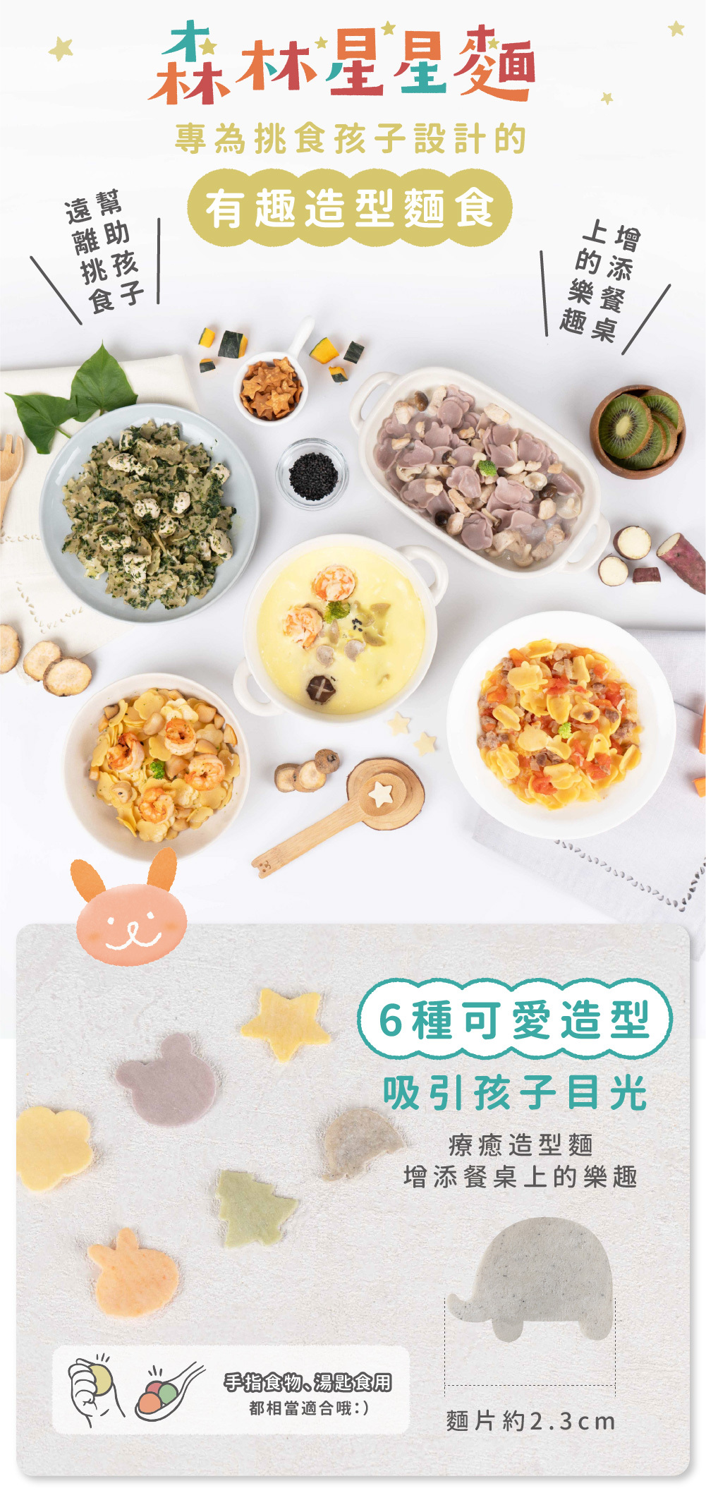 特別推出每款各11種造型的特別星星麵系列,麵片為1.5cm,比常態款的星星麵(2.3cm)更小巧一些,特別款也選用了四種蔬果(綜合款),讓營養樂趣一次滿足!