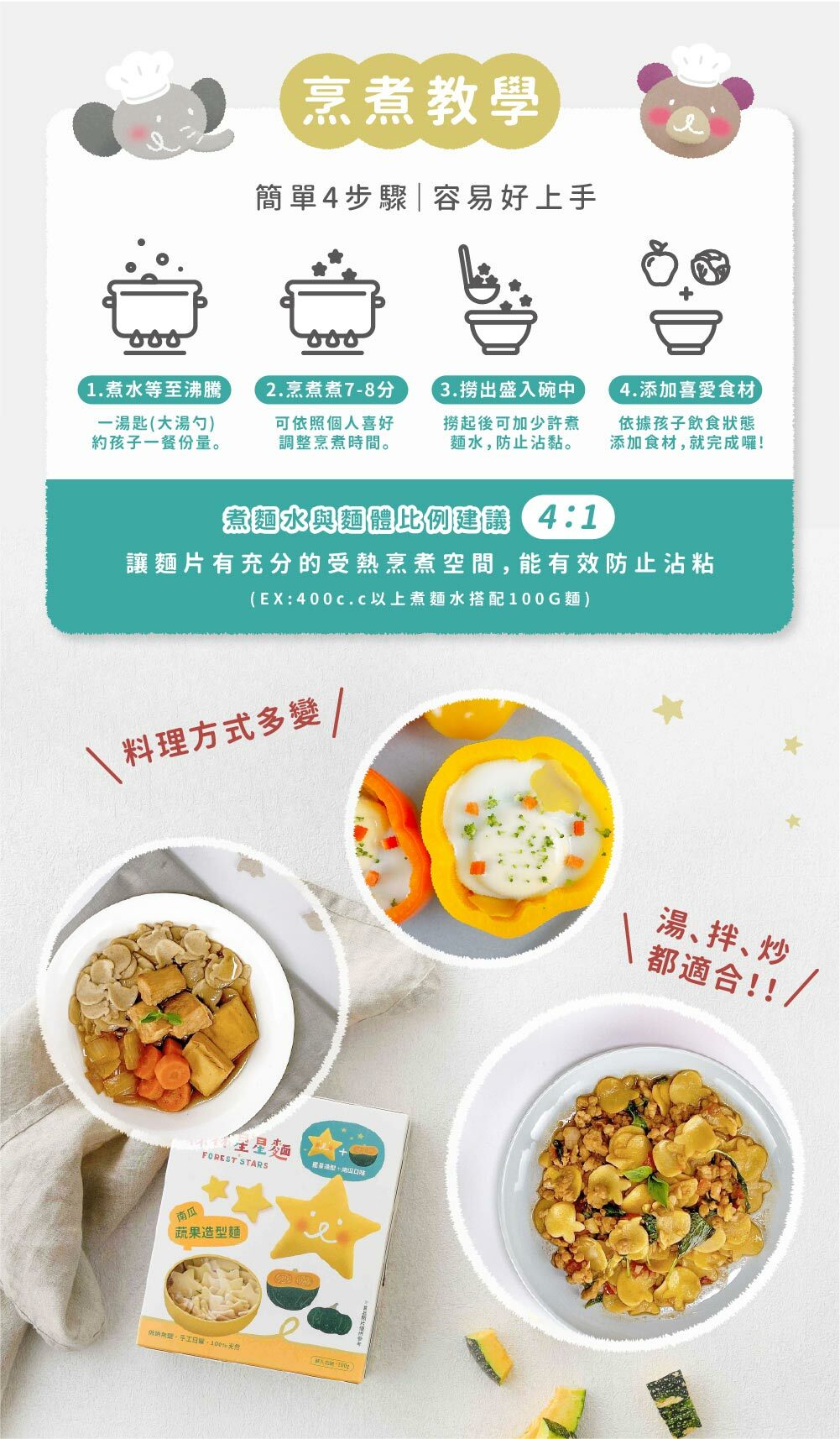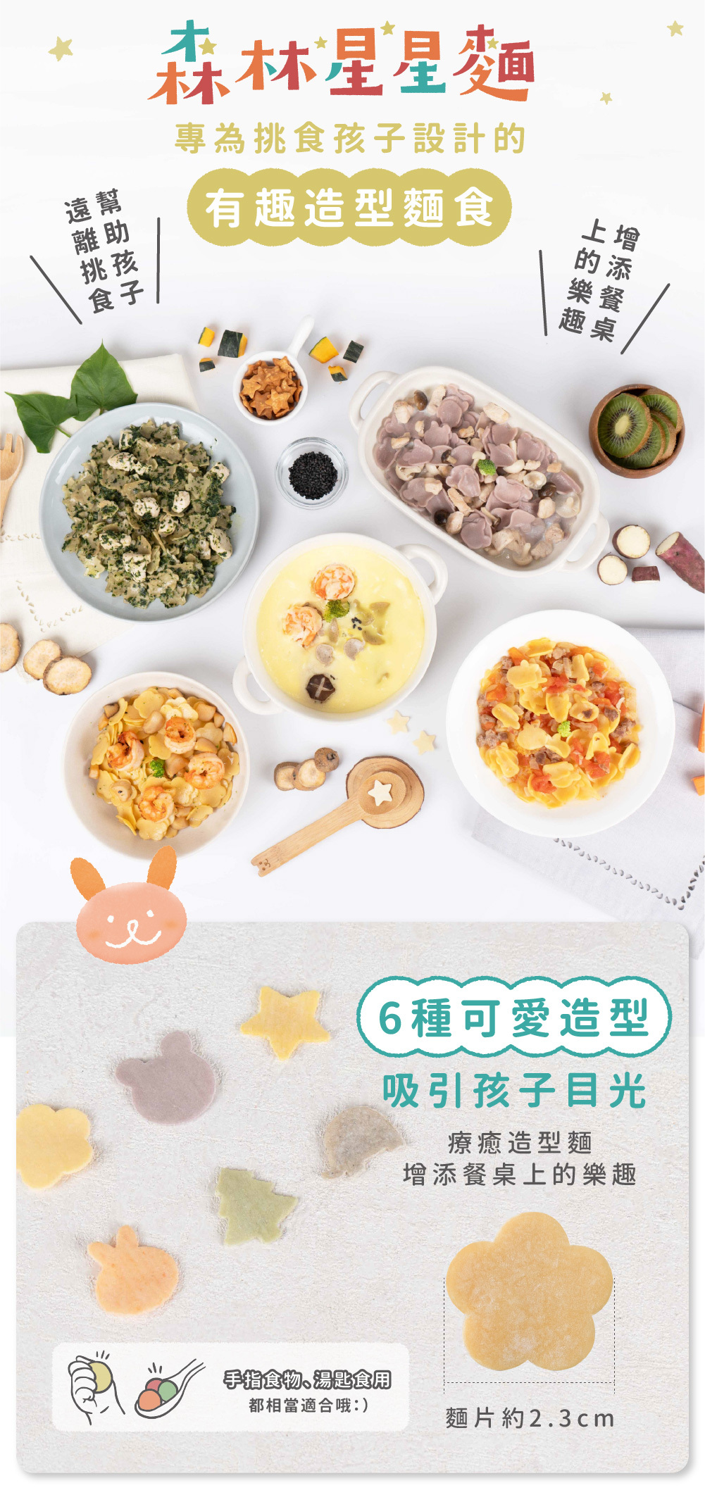 特別推出每款各11種造型的特別星星麵系列,麵片為1.5cm,比常態款的星星麵(2.3cm)更小巧一些,特別款也選用了四種蔬果(綜合款),讓營養樂趣一次滿足!