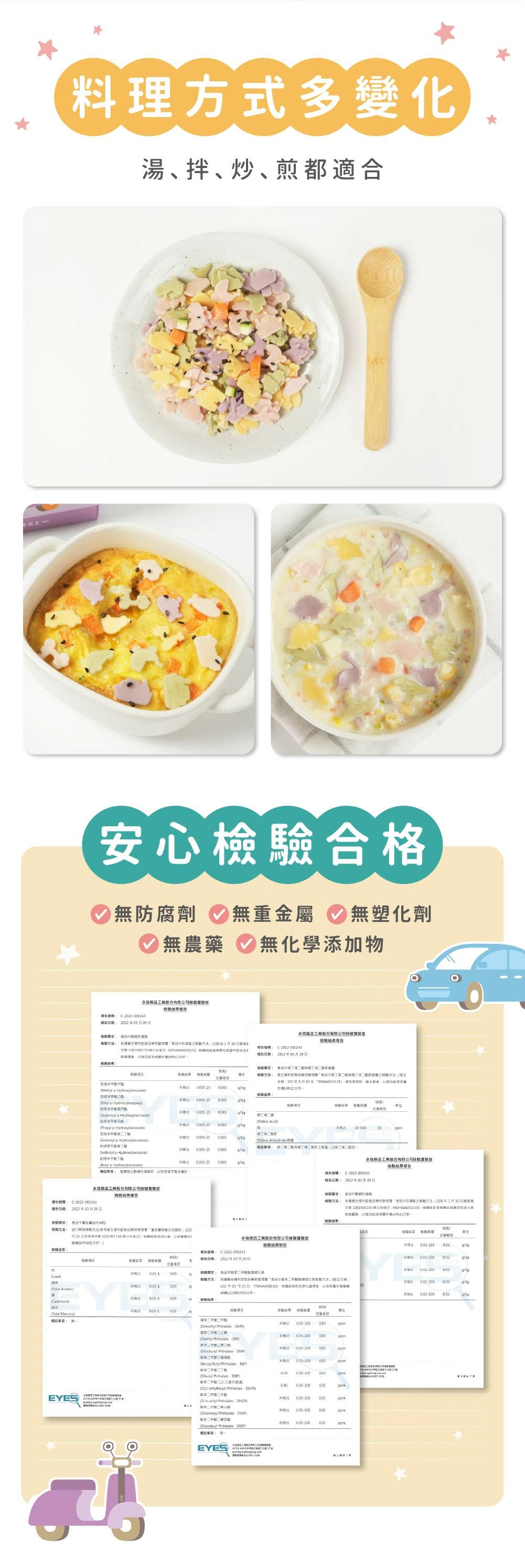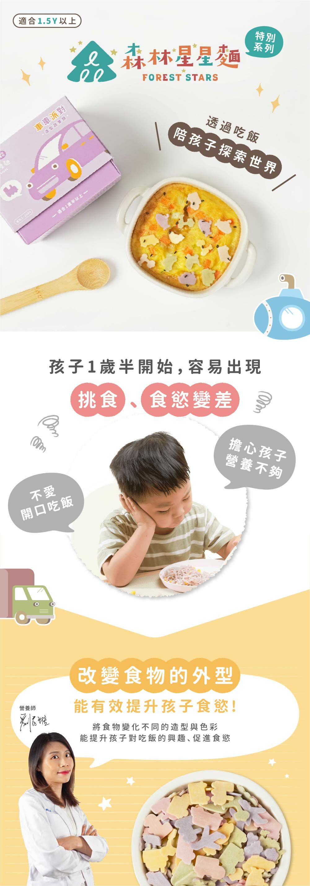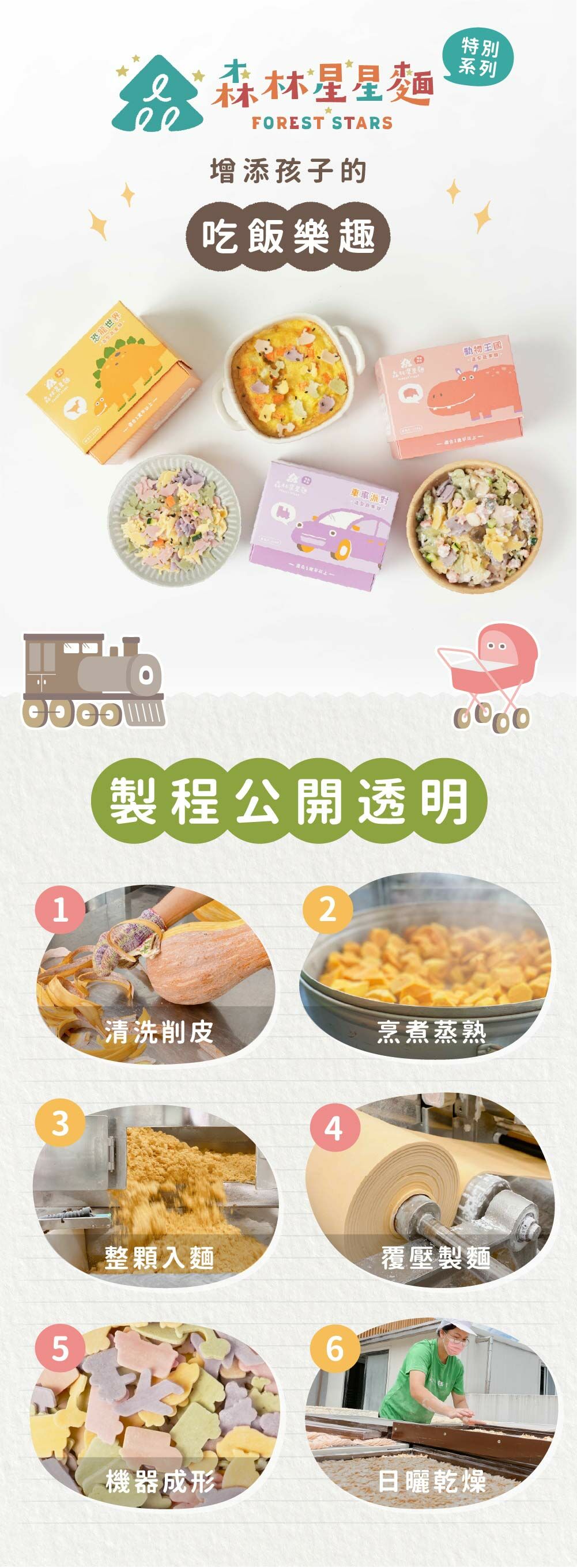 特別推出每款各11種造型的特別星星麵系列,麵片為1.5cm,比常態款的星星麵(2.3cm)更小巧一些,特別款也選用了四種蔬果(綜合款),讓營養樂趣一次滿足!